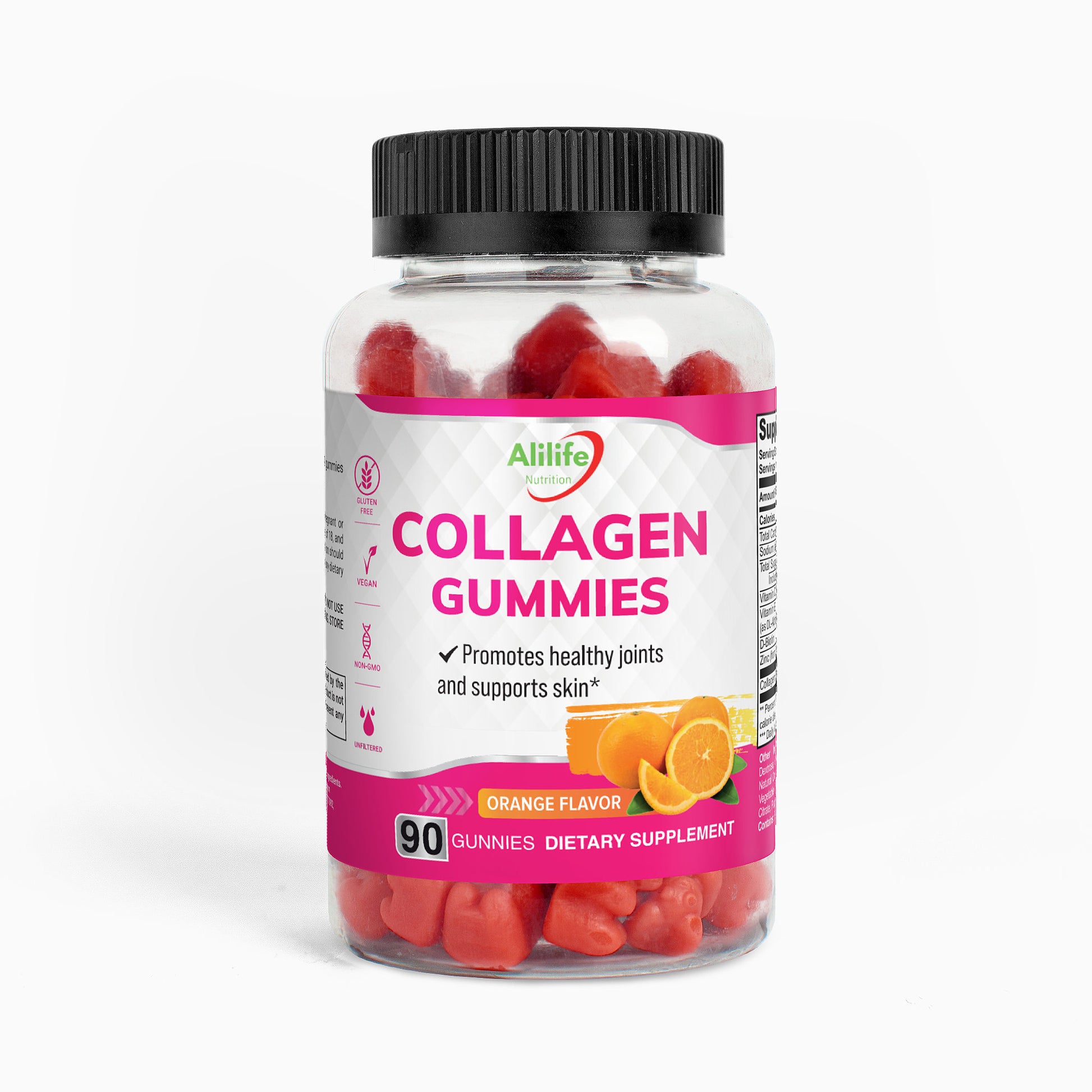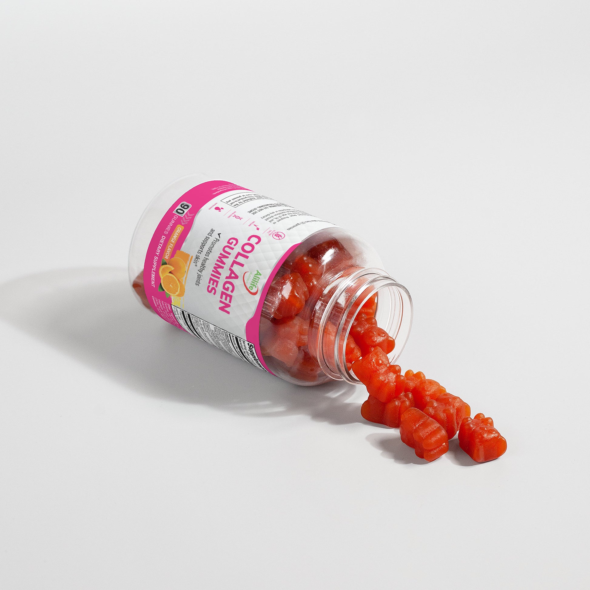 Ingredients: Sodium (as Sodium Citrate), Vitamin C (as Ascorbic Acid), Vitamin E (as DL-Alpha-Tocopheryl Acetate), D-Biotin, Zinc (from Zinc Citrate), Collagen Peptide, Sugar, Glucose Syrup, Dextrose, Glycine, Pectin, Coconut Oil, Citric Acid, Natural Orange Flavor, Sucrose fatty acid ester, Vegetable Oil (contains Carnauba Wax), Sodium Citrate, Purple Carrot Juice Concentrate.